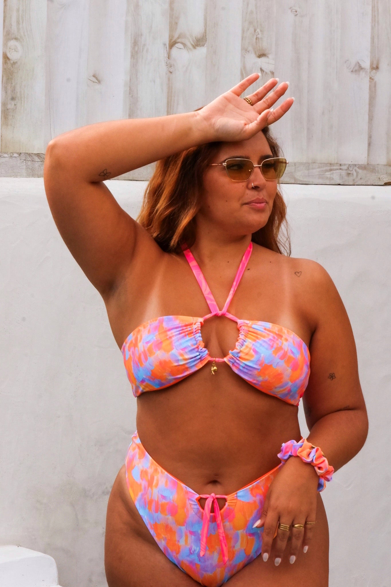 A modelo está a vestir M de top e XL de cueca (tanga).